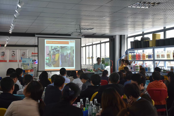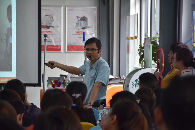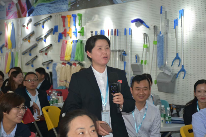由施達總部的業務營運劉經理給來賓們講解演示產品在日常保潔的實際應用和管理。