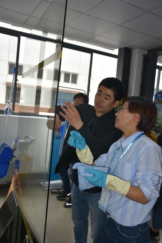 通過裝配保潔服務車及擦玻璃兩個小游戲,讓來賓們更深刻體驗到日常保潔工具的搭配及使用,互動交流體會心德。最后通過小測驗,對通過考核的來賓們頒發證書。