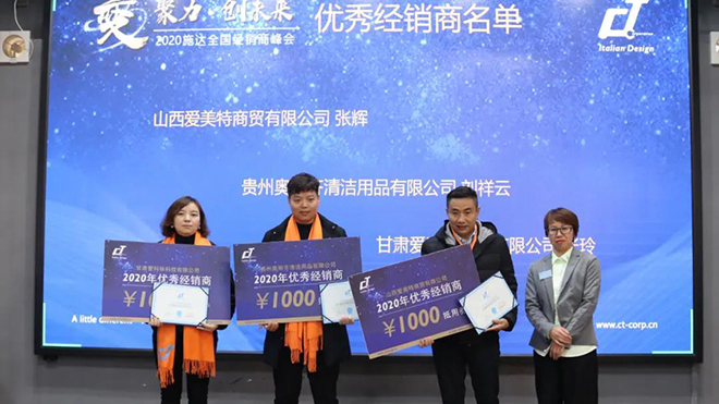 在大會(huì)頒獎(jiǎng)環(huán)節(jié),頒獎(jiǎng)嘉賓分別向2020有突出貢獻(xiàn)的施達(dá)經(jīng)銷商進(jìn)行頒獎(jiǎng),山西愛(ài)美特商貿(mào)有限公司、貴州奧麗齊清潔用品有限公司、甘肅愛(ài)科林科技有限公司榮獲“2020施達(dá)優(yōu)秀經(jīng)銷商”稱號(hào)。