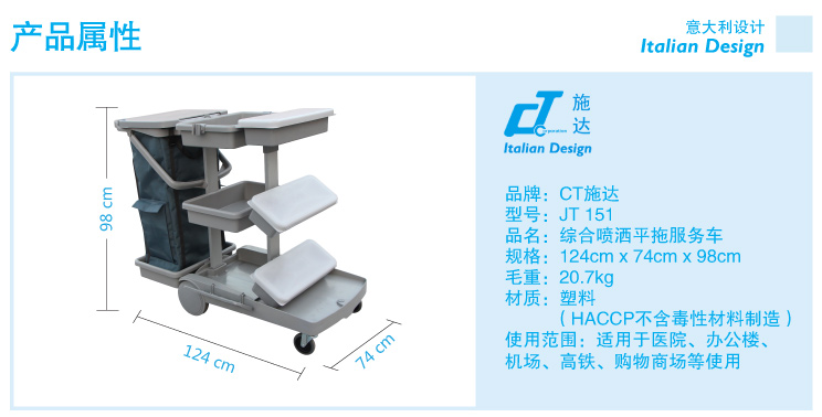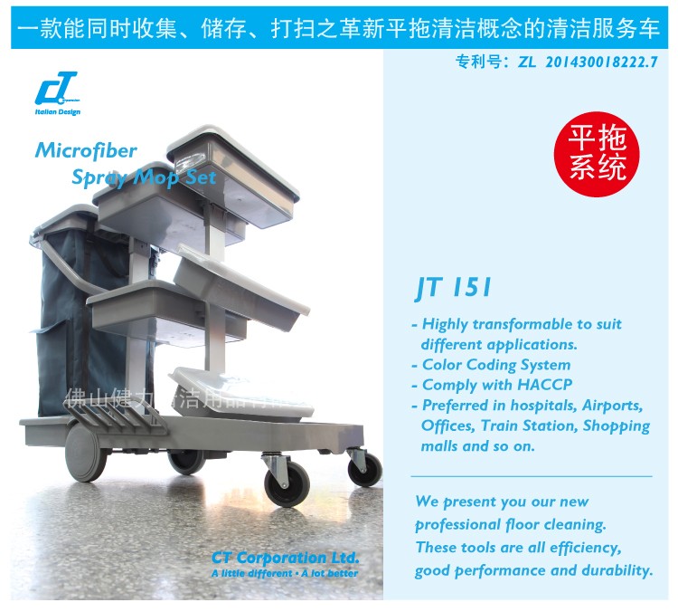 佛山施達產品中央清洗保潔系統核心平臺: 施達JT 151綜合噴灑平拖服務車以出色的設計和革新的清潔理念榮獲“年度清潔用品皇冠獎”。